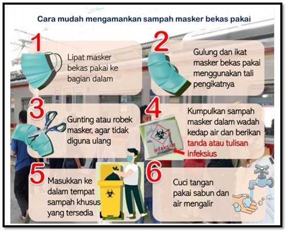 Jika belum tersedia tempat sampah khusus masker, maka pengelolaan masker bekas bisa mengikuti berikut ini :